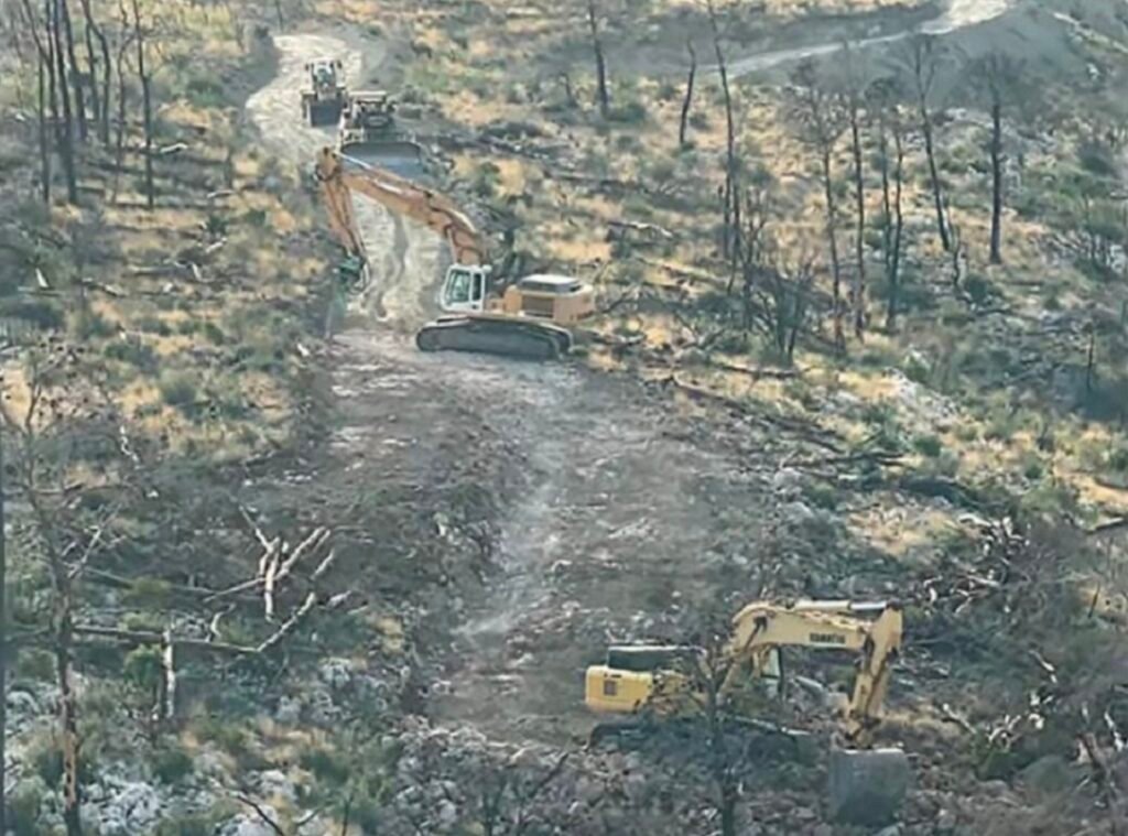 Οι μπουλντόζες καταστρέφουν το μονοπάτι κατεβαίνοντας προς το ρέμα. Πίσω και ψηλότερα διακρίνεται ο Άι …