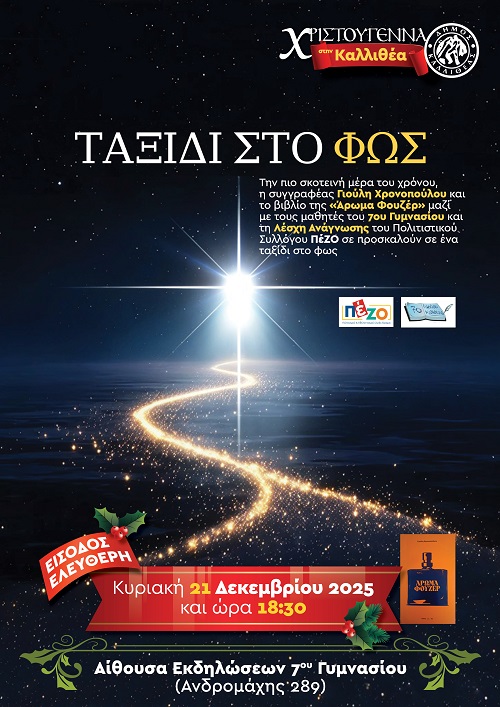 Η συγγραφέας Γιούλη Χρονόπουλου και το βιβλίο της «Άρωμα Φούζερ» μαζί με τους μαθητές του 7ου Γυμνασίου, η Λέσχη Ανάγνωσης και οι θεατρικές ομάδες του Πολιτιστικού Συλλόγου ΠέΖΟ, σας προσκαλούν σε ένα ταξίδι στο φως.
