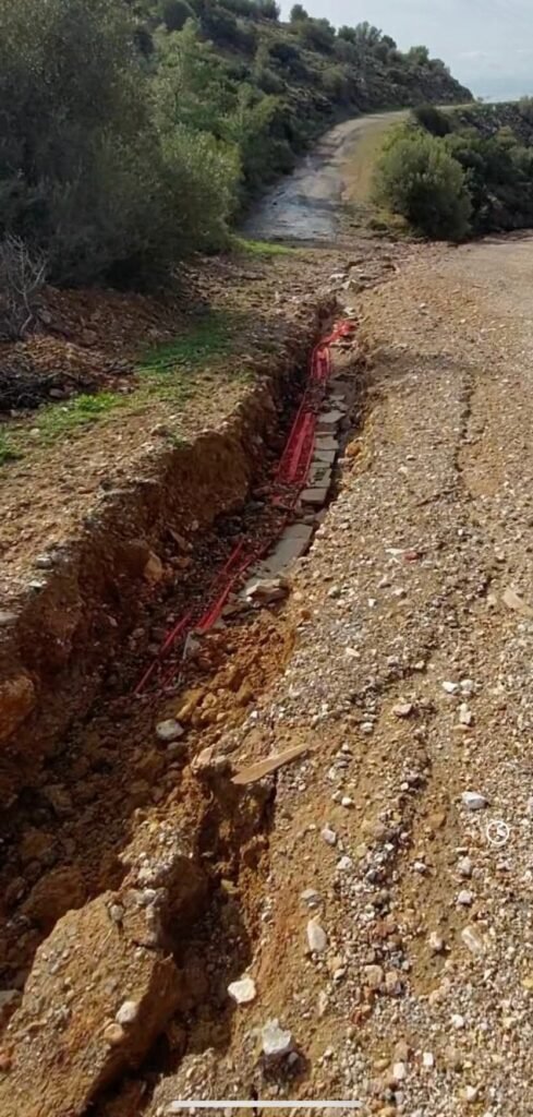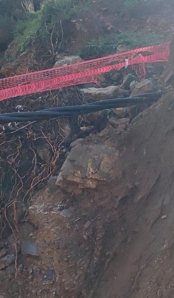 Άφησαν μάλιστα κατά την εκτέλεση των έργων κάποιον σωλήνα (!) για να περάσουν τα νερά… Το αποτέλεσμα το βλέπετε στις εικόνες, το νερό παρέσυρε τα πάντα και τα καλώδια πλέον κρέμονται στον αέρα, πάνω από τη ρεματιά.