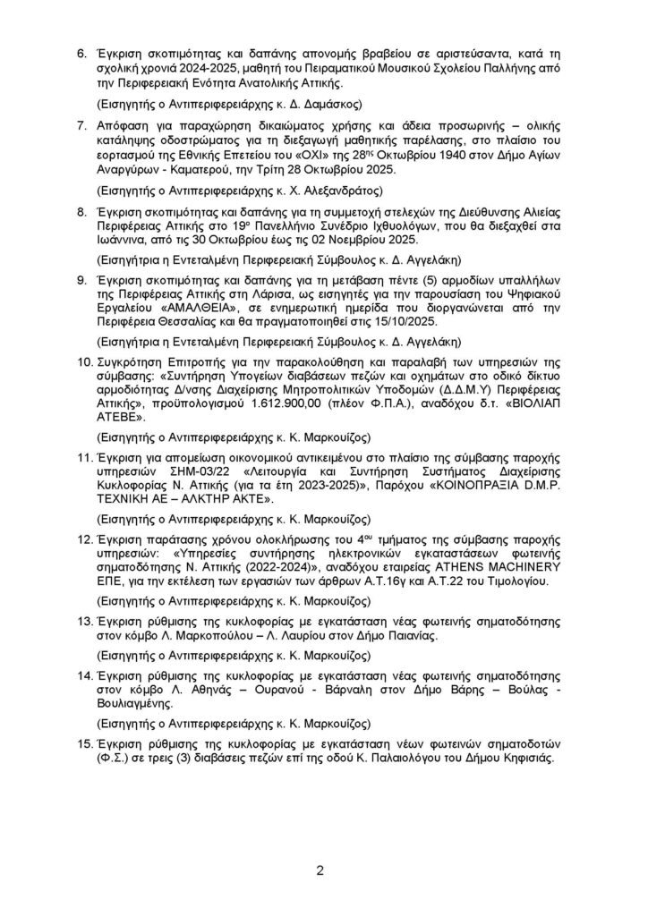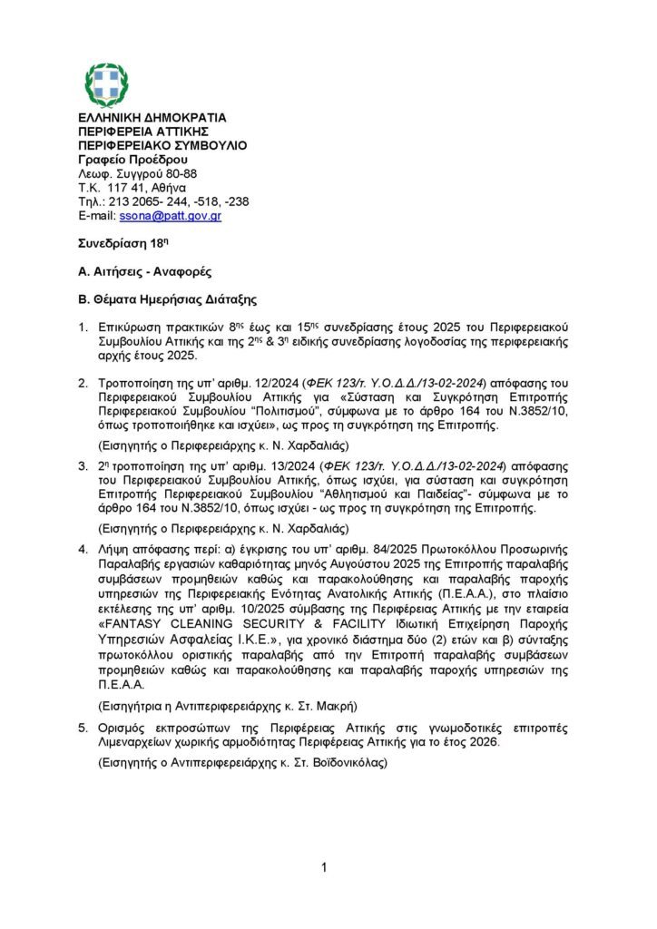 τη Δευτέρα 29 Σεπτεμβρίου 2025Το Περιφερειακό Συμβούλιο Αττικής, κατόπιν πρόσκλησης του Προέδρου του, Β. Καπερνάρου, πρόκειται να συνεδριάσει τη Δευτέρα, 29-09-2025 και ώρα 15:00. Η συνεδρίαση θα πραγματοποιηθεί δια ζώσης, στο Συνεδριακό – Πολιτιστικό Κέντρο του Δημαρχιακού Μεγάρου Περιστερίου (Ταχ. Δ/νση: Πλατεία Δημοκρατίας 1, Περιστέρι) .