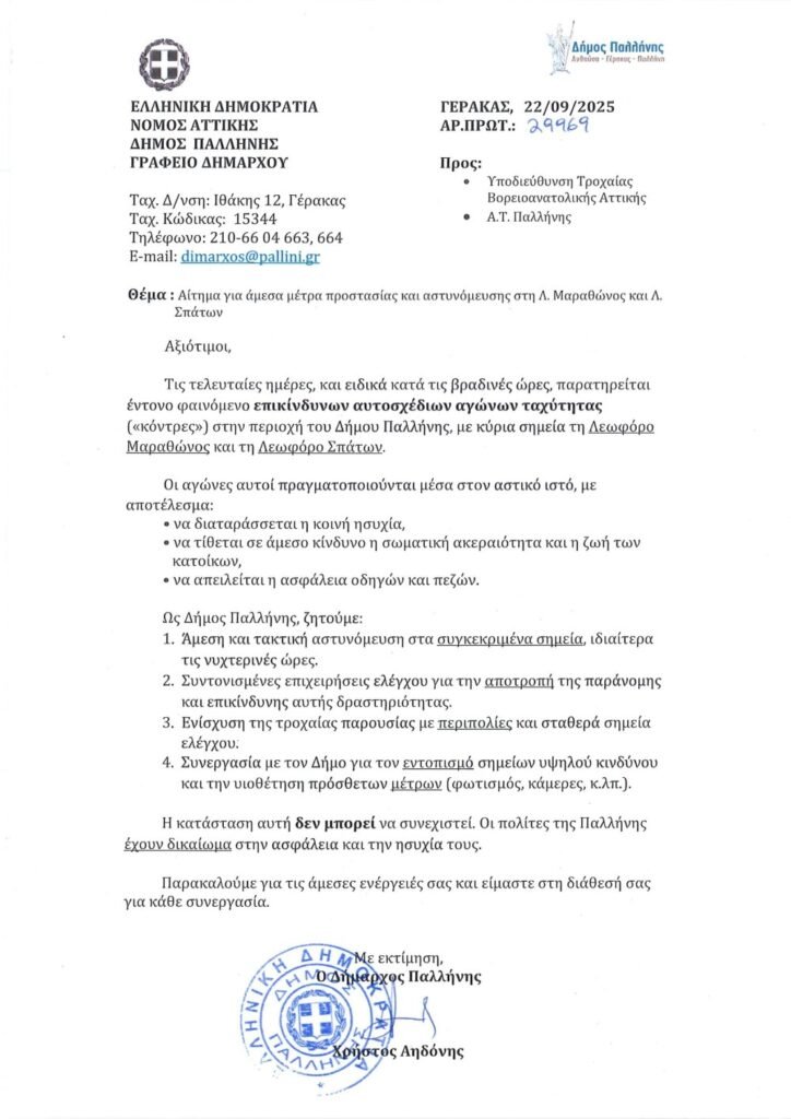 Ο Δήμος Παλλήνης προχώρησε σε επίσημο αίτημα προς την Υποδιεύθυνση Τροχαίας Βορειοανατολικής Αττικής και το Αστυνομικό Τμήμα Παλλήνης, ζητώντας την άμεση λήψη μέτρων για την αντιμετώπιση του επικίνδυνου φαινομένου των αυτοσχέδιων αγώνων ταχύτητας («κοντρών») που παρατηρούνται τις τελευταίες ημέρες στις Λεωφόρους Μαραθώνος και Σπάτων.