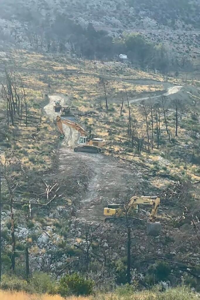Οι μπουλντόζες καταστρέφουν το μονοπάτι κατεβαίνοντας προς το ρέμα. Πίσω και ψηλότερα διακρίνεται ο Άι Γιώργης.