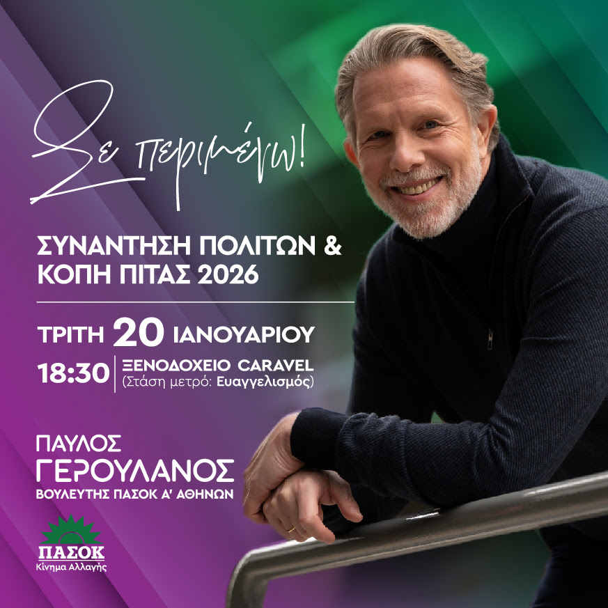 Την Τρίτη 20 Ιανουαρίου, στις 18:30, ο Κοινοβουλευτικός Εκπρόσωπος και Βουλευτής Α’ Αθήνας του ΠΑΣΟΚ–Κινήματος Αλλαγής, Παύλος Γερουλάνος, θα πραγματοποιήσει ανοιχτή συνάντηση πολίτων και κοπή πρωτοχρονιάτικης πίτας στο ξενοδοχείο Caravel.