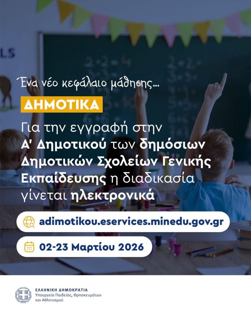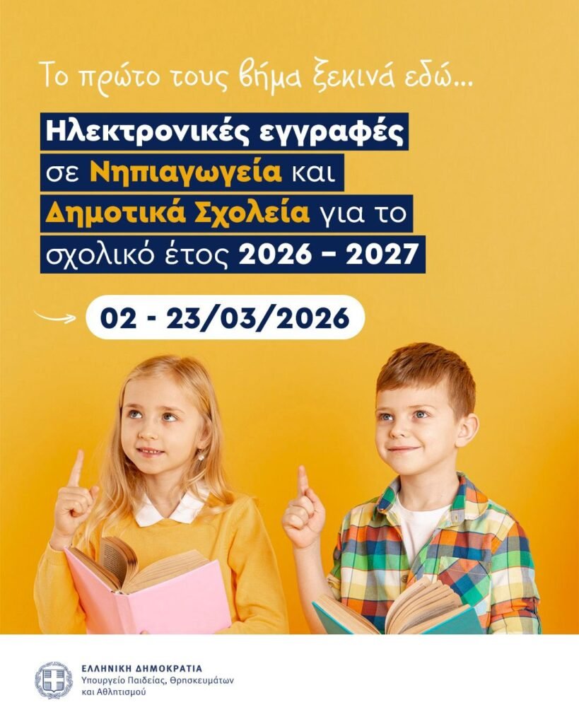 Ξεκινούν οι ηλεκτρονικές εγγραφές σε Νηπιαγωγεία και Δημοτικά Σχολεία για το σχολικό έτος 2026-2027